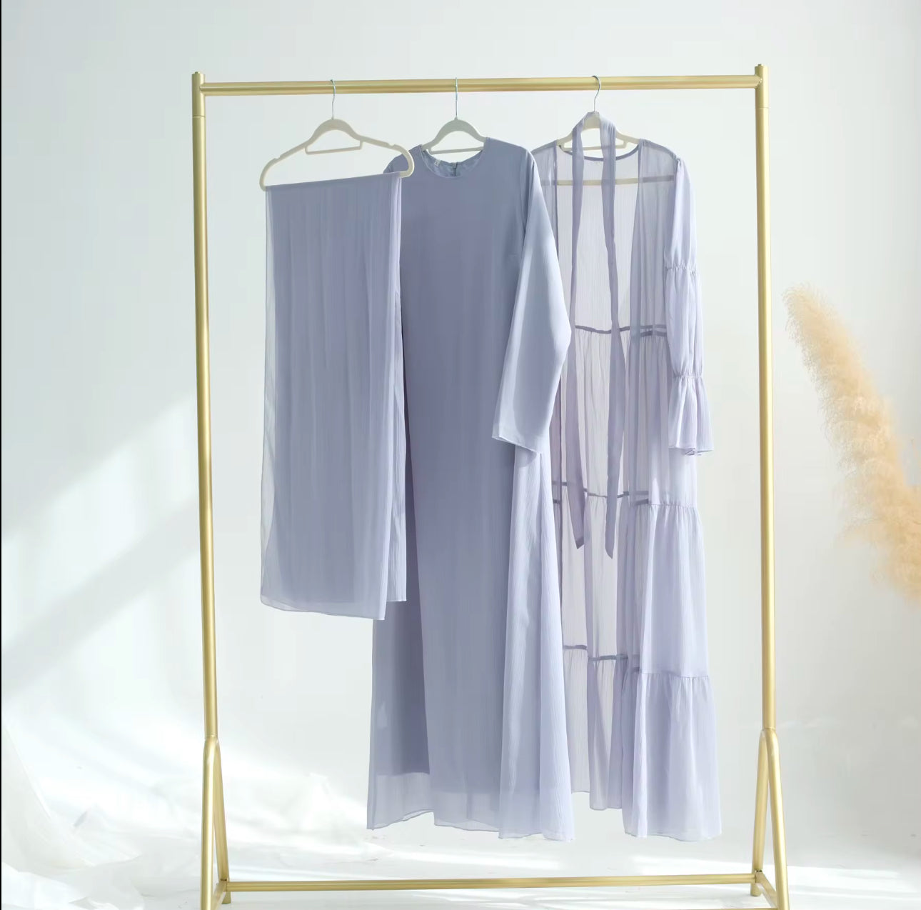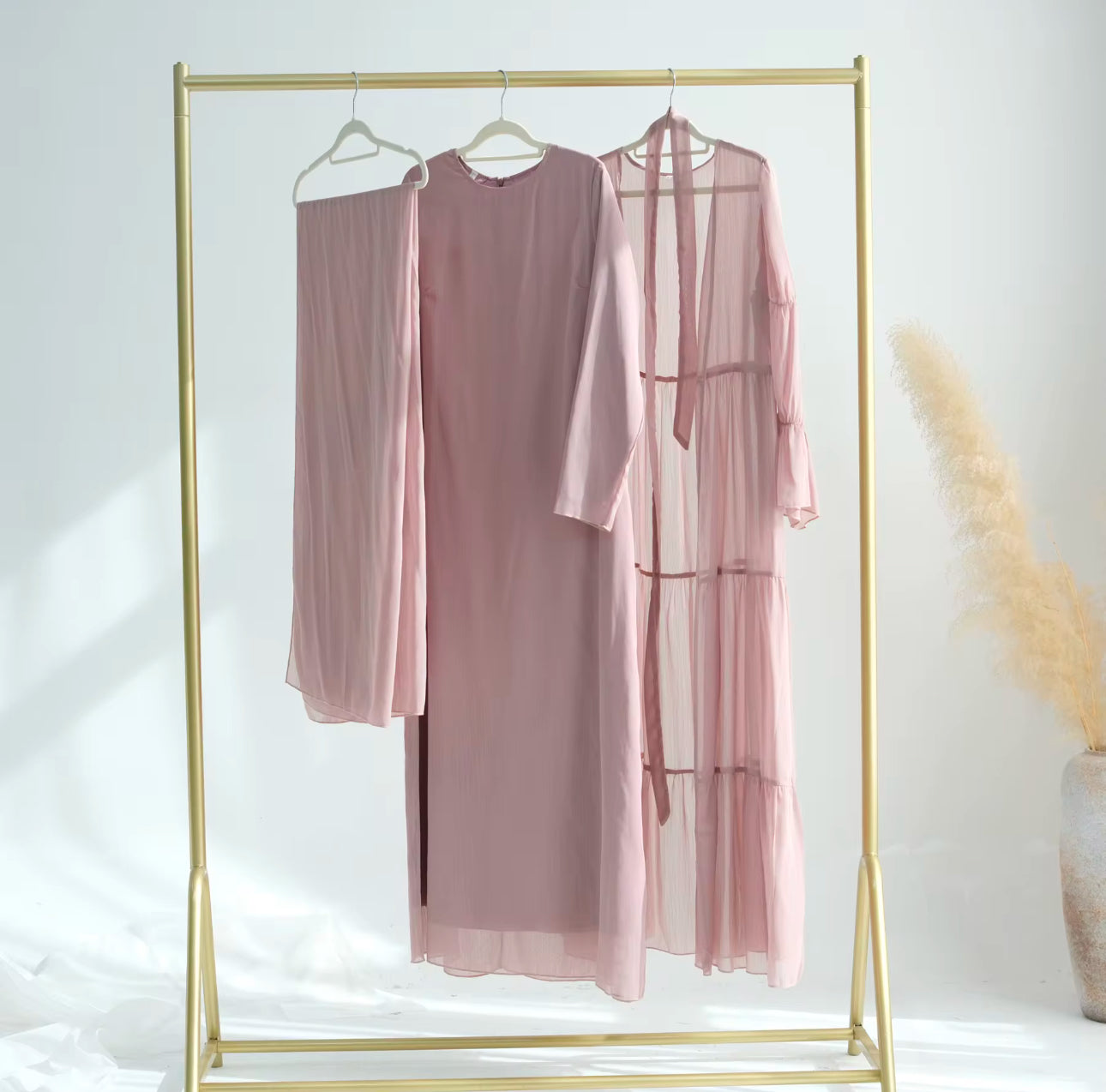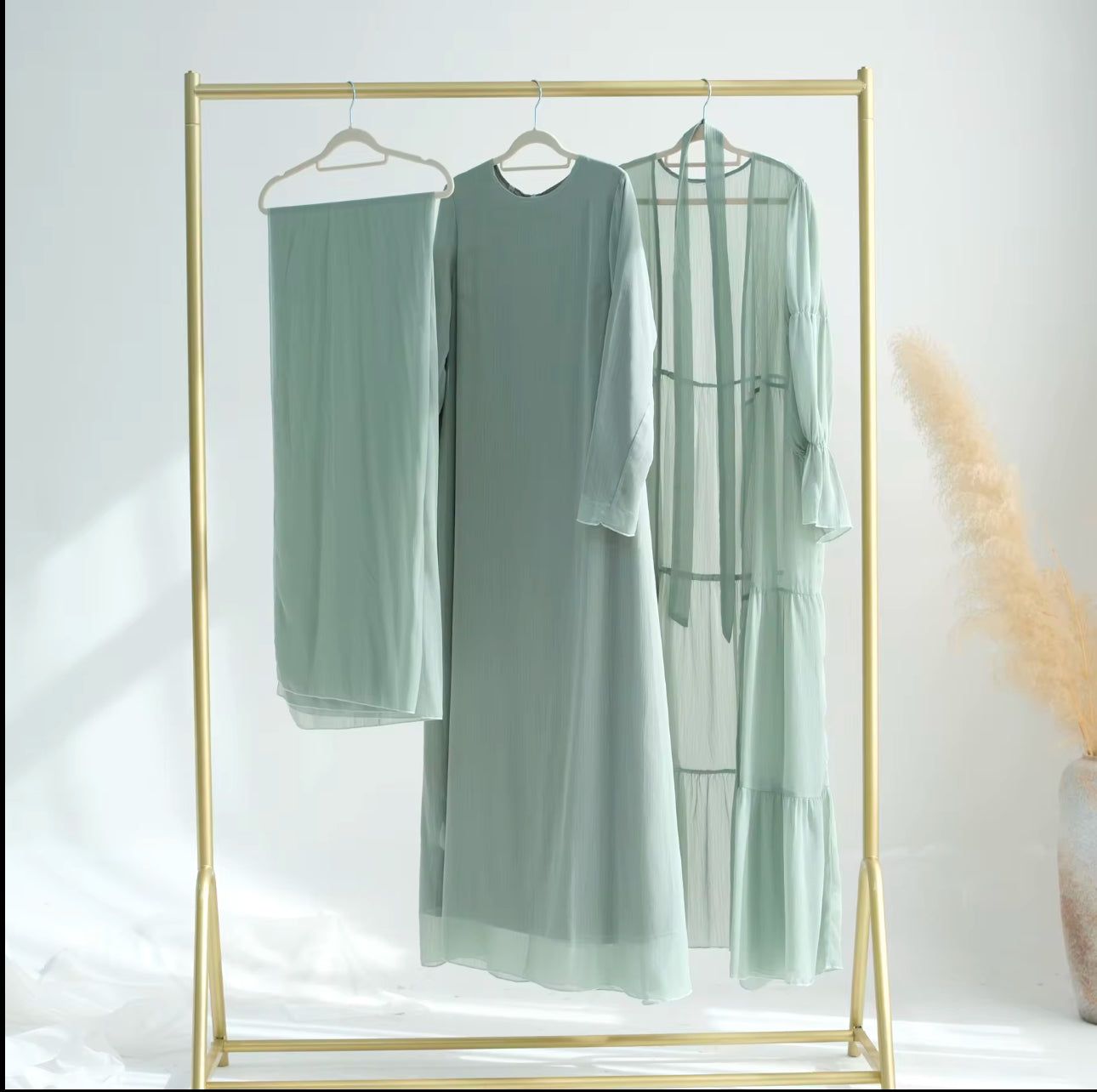 This chiffon bohemian style Abaya is a timeless design that can be worn year round. Includes underdress, chiffon jacket and matching hijab.
