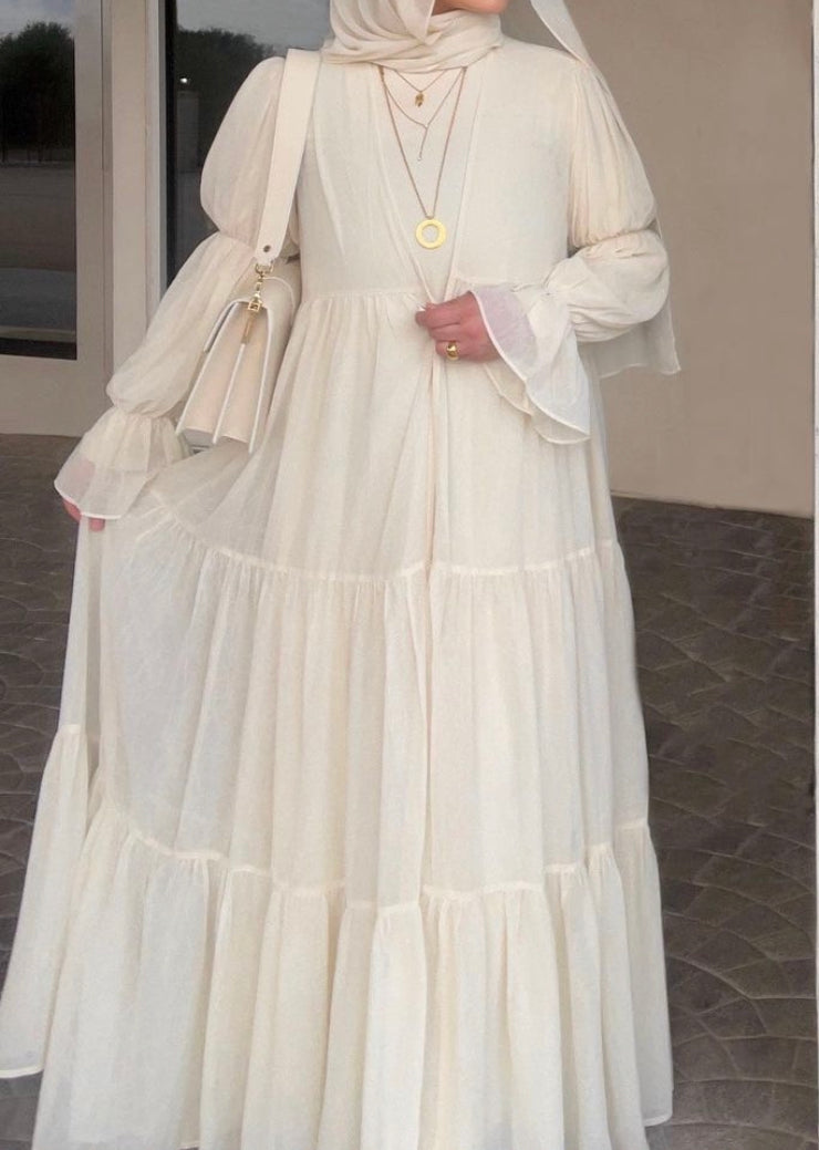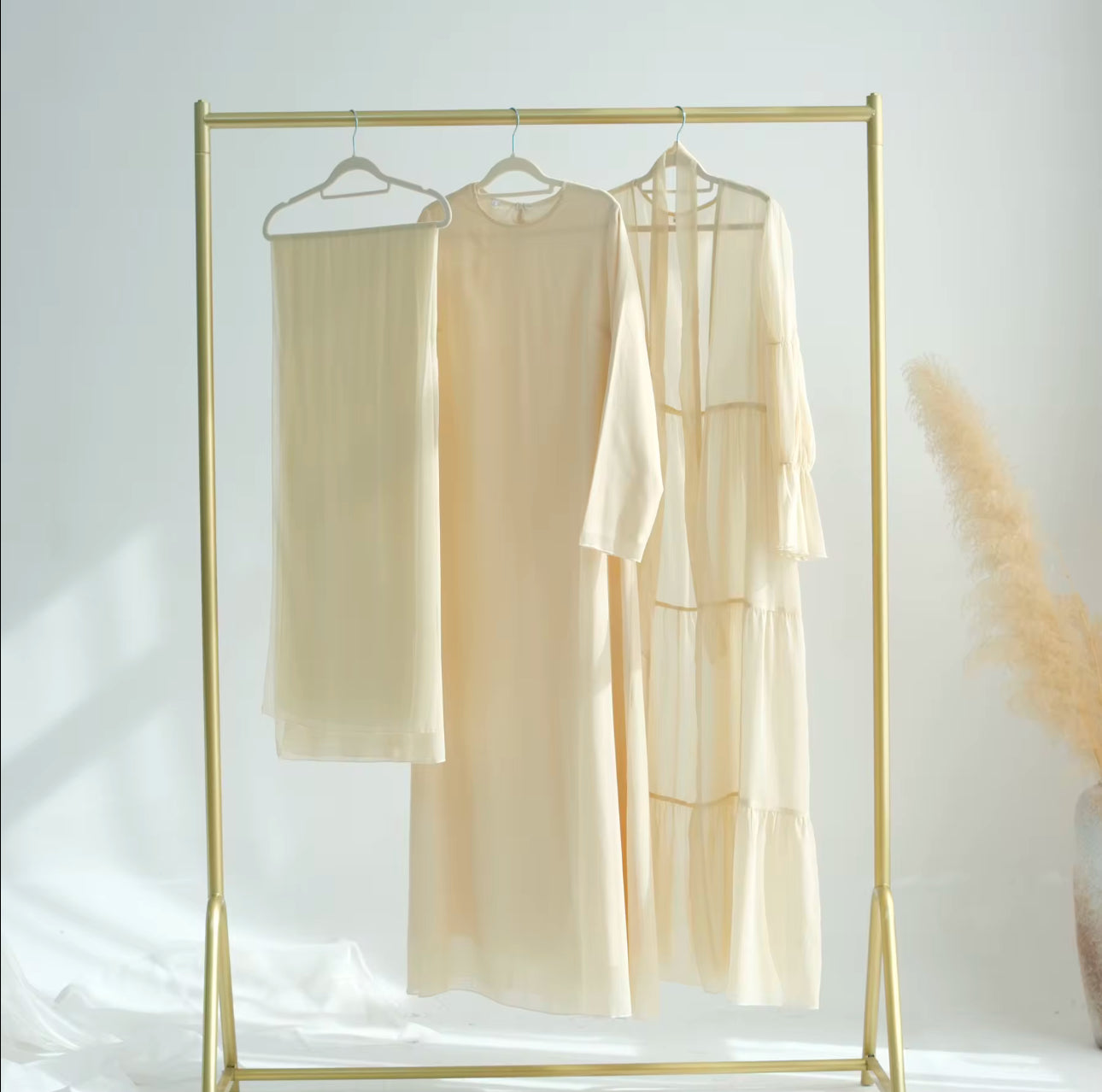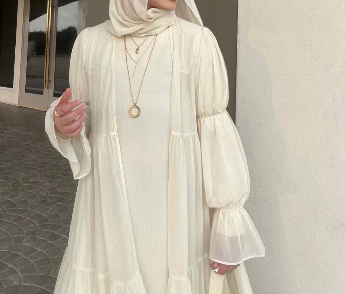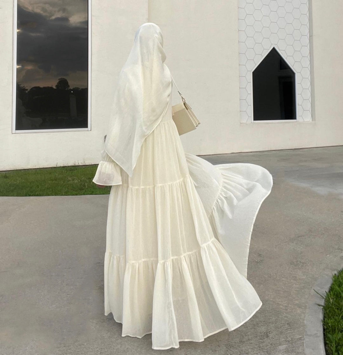 This chiffon bohemian style Abaya is a timeless design that can be worn year round. Includes underdress, chiffon jacket and matching hijab.