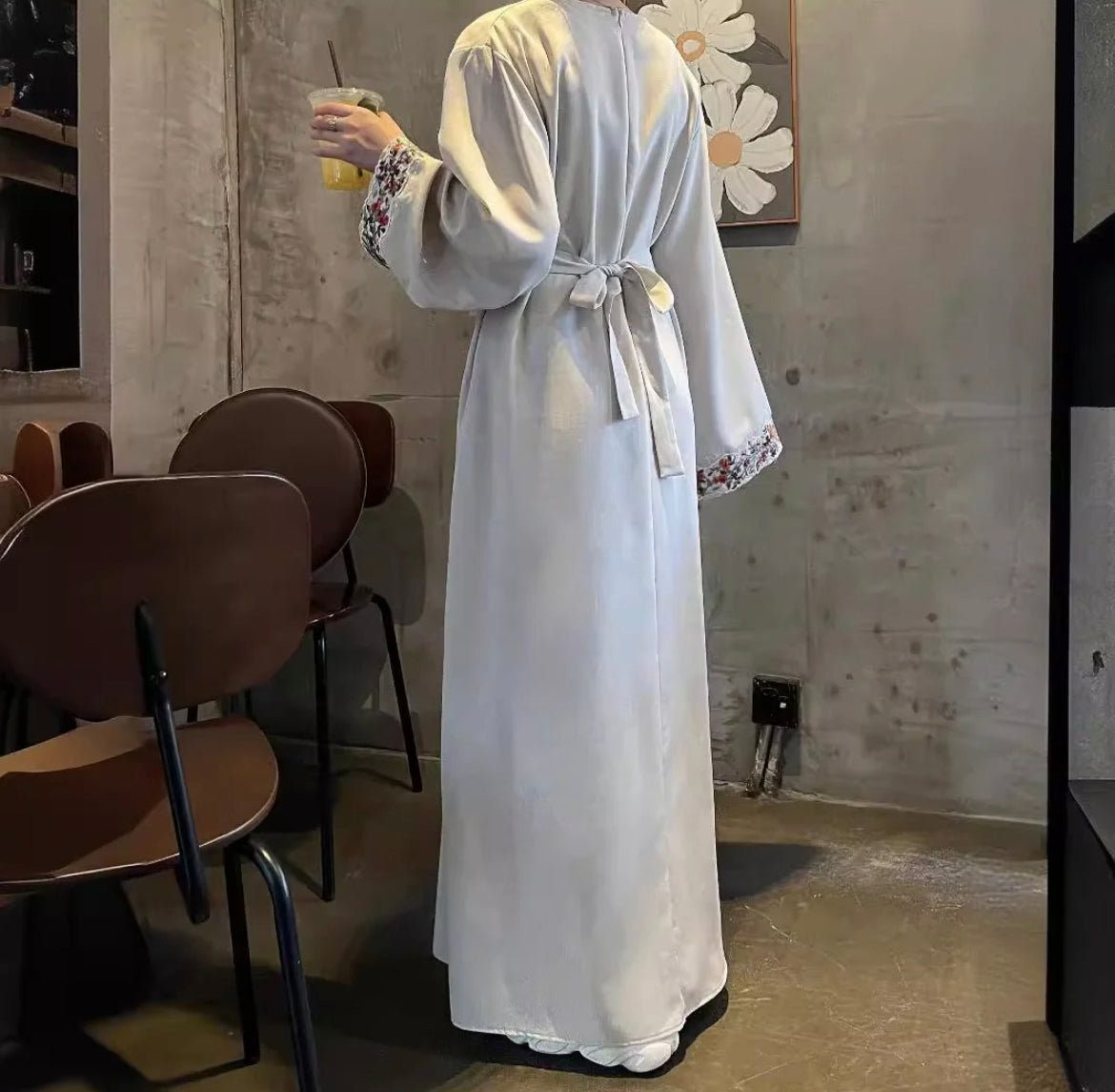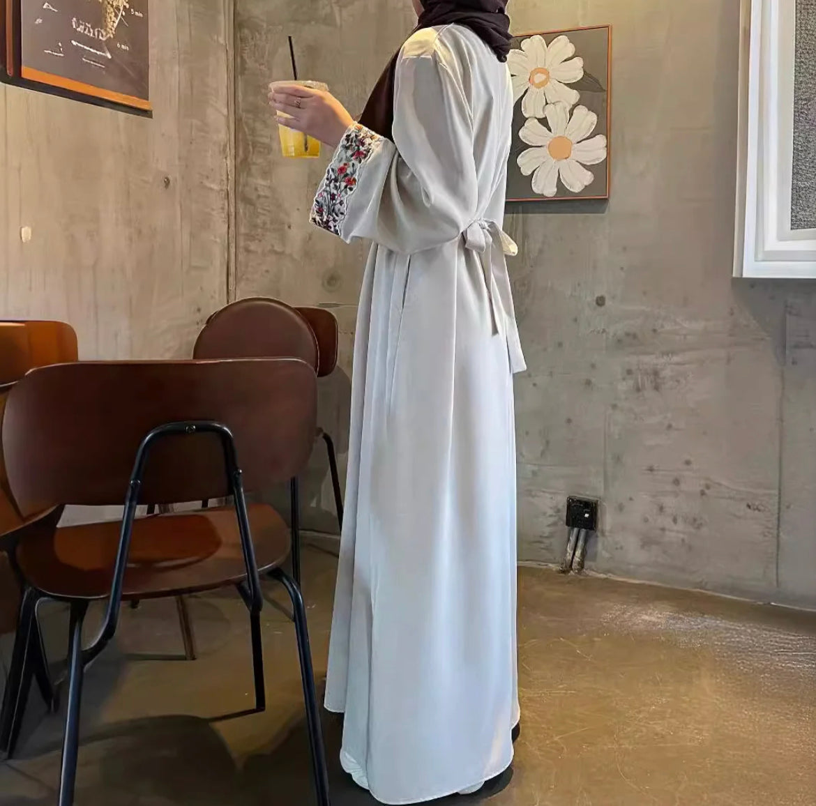 Design: Featuring intricate floral embroidery on the sleeves and waist, this abaya combines traditional modesty with contemporary elegance. The included belt can worn tight to accentuate the waist or looser for more modesty.