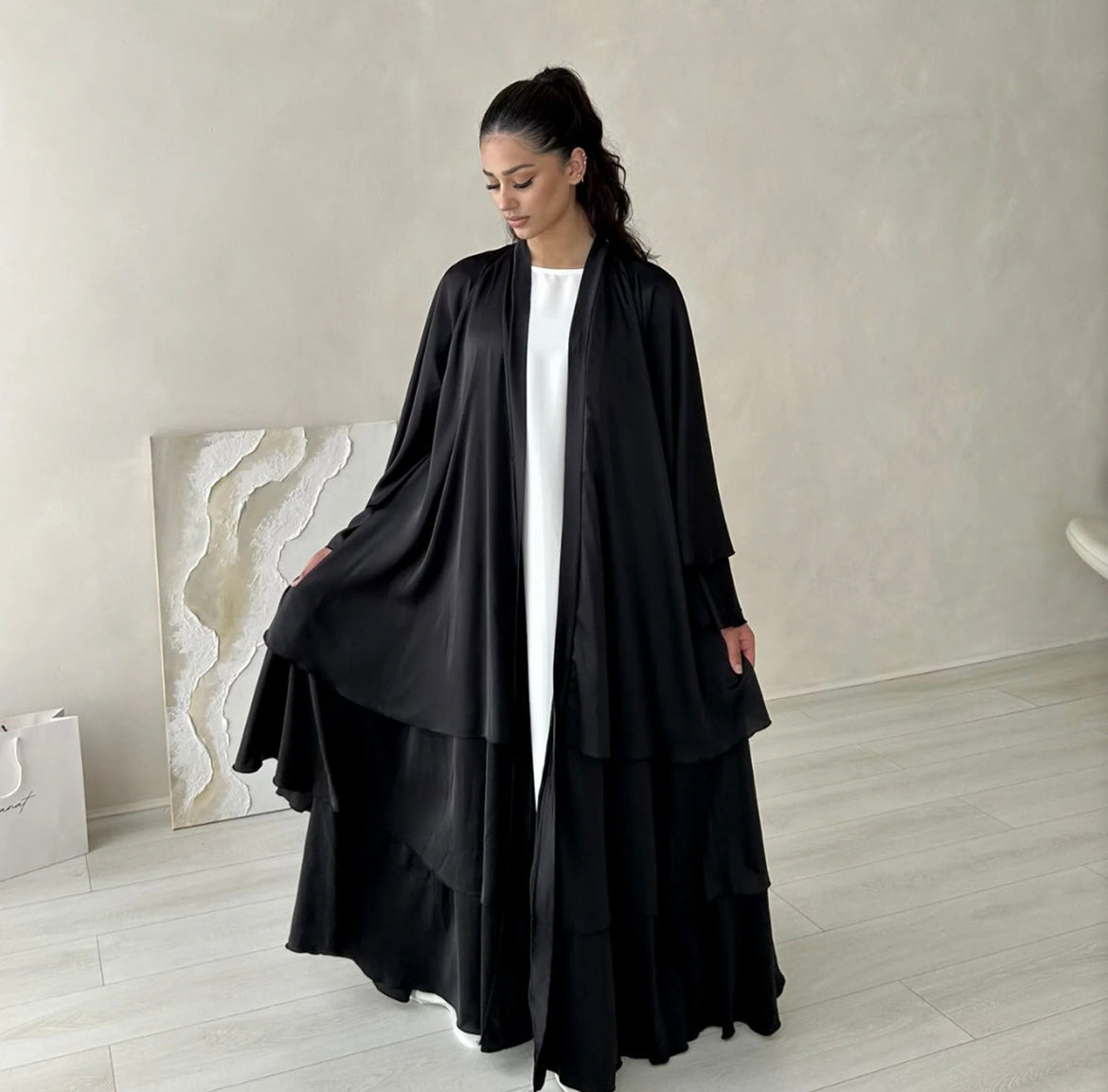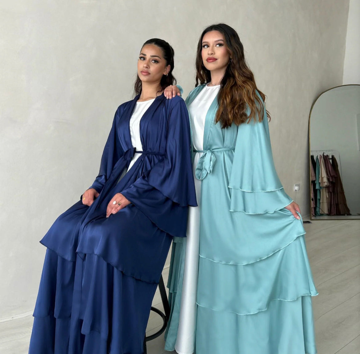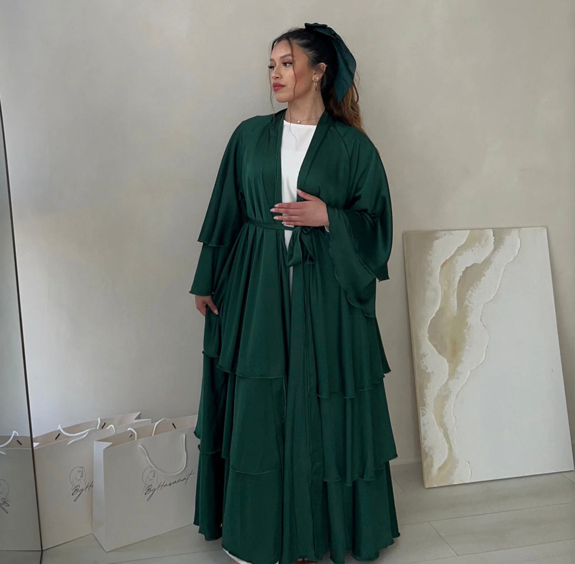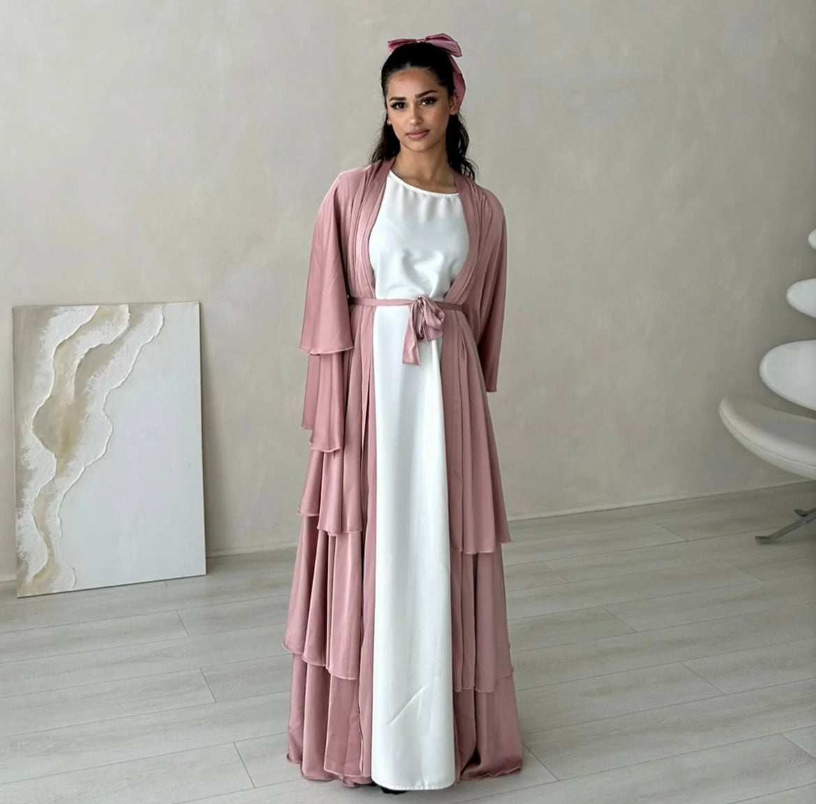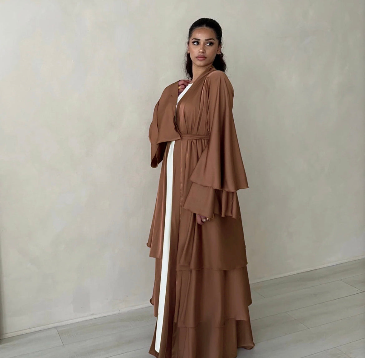 Vintage and elegant maxi abaya dresses for women, with adjustable waist belt, flare long sleeves, open front cardigan, maxi long, Layered design, ruffles trim. Simple solid color, flowy loose-fitting.
